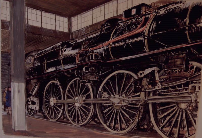 Pour l’anecdote, il se trouve par hasard que le jour (il y a quarante ans déjà) où j’ai peint cette gouache dans la rotonde de MULHOUSE NORD s’y trouvait également Albert Brenet réalisant le carton d’une des affiches pour le Musée Français des Chemins de Fer, celle représentant la 220 NORD n° 701 couleur vert pomme. Nous pûmes échanger quelques mots (très déférents de ma part, différence d’âge et de talent oblige !)